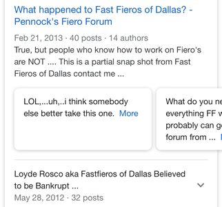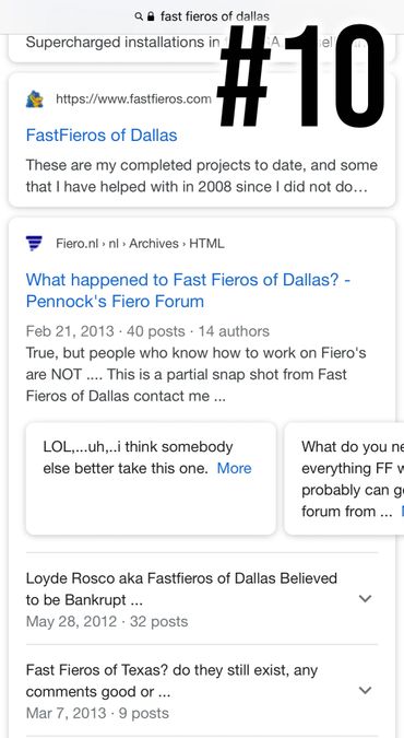Looking up “Fast Fieros of Dallas” (phrase seen on Google search associated with Loyde Rascoe) got REALLY interesting. Lots of posts of customers saying “Loyde” took thousands and thousands of their money, their cars, and in many cases for performance work BUT Loyde never did anything with the cars. He let them sit in his backyard, never to complete the project or repay the money. After doing this to a few dozen people, people got suspicious and started making threads about who else had fallen victim to Loyde Rascoe. This is when he left the forum and stopped responding to anyone. Police and apparently the FBI got involved and lots of unhappy people that never got the work done that they paid for. You can look at endless forum postings and shitposting about Loyde by Googling “Fast Fieros of Dallas”.