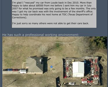 Google Earth helped confirm the "Fiero Acres" resort LOL. Except the cars don't come back refreshed, they come back sun damaged with no work completed. If you look at Google Earth now with his address, you'll still see the Fiero's in the backyard. The appear to be in the process of the getting buried in the Texas landscape, slowly but surely.