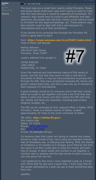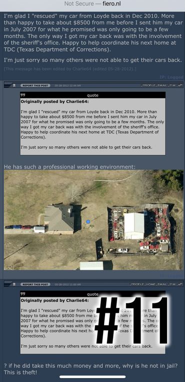 You can look at endless forum postings and shitposting about Loyde by googling “Fast Fieros of Dallas”. Users discuss their nightmare experiences losing $8,000-10,000 of deposits EACH. There are so many victims that the amount of money lost from everyone much be in the six figures. People not receiving cars or product and some needing to get the law involved to pull their cars out of there. Loyde then, after being caught red handed, leaves the forum and disappears for two plus years – goes overseas and no longer responds to anyone. On his website he cryptically states “under new ownership” to quell the ocean of emails he was getting from people looking for their money. You will see a pattern of Loyde being a forum help and befriending all of these people as an expert, then taking all their money and turning his back on them.